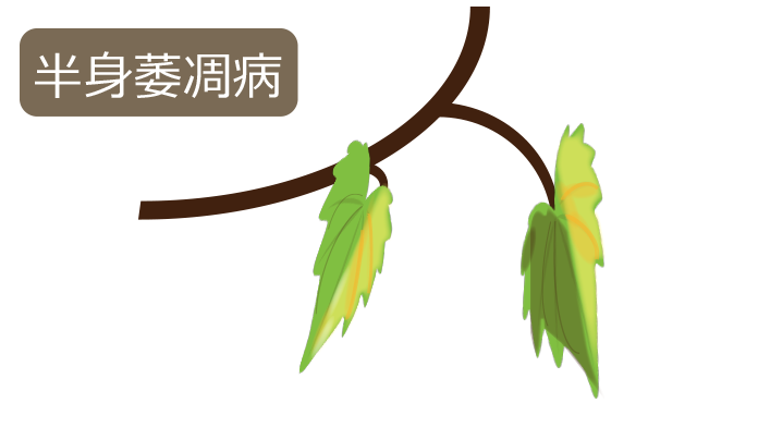 糸状菌が原因の主に土壌伝染性の病気です。株の片側の葉だけが黄色くしおれ、葉のふちが上側に巻き上がります。酷くなると株全体の葉がしおれて枯れます。良く似た症状で萎凋が見られない場合は半枯病という他の病気です。