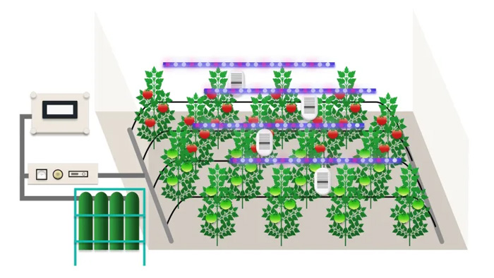 ハウス内にCO₂/Airを局所的に放出。光合成を活発化、成長促進させます。最大4つのエリア/2つのセンサでエリアごとに局所独立制御可能です。