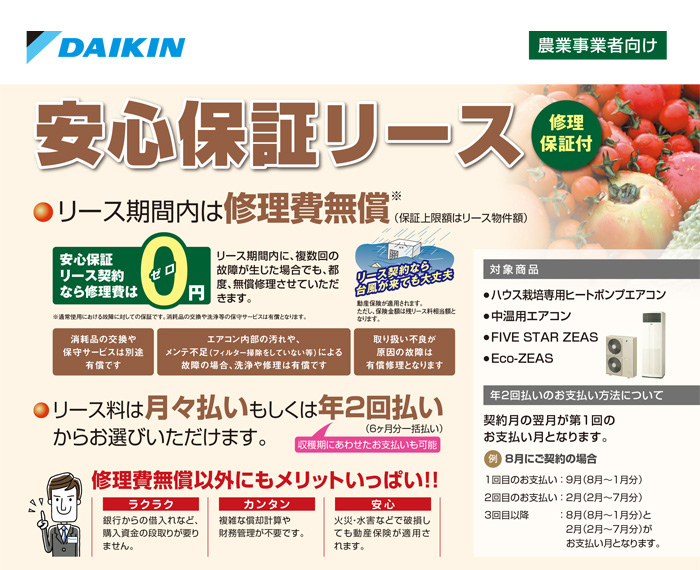 ヒートポンプエアコンを長く・安心してご使用いただくための修理保証付きリース!