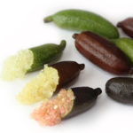 フィンガーライムはオーストラリア原産の柑橘類です。品種が豊富で、果皮、果粒ともに色、形などさまざまな種類があります。緑色の果粒が鮮やかな「クリスタルグリーン」、気温が下がると赤みが増す「ピンクアイス」、透明感のある「サンシャインイエロー」、赤色が美しい「ジャリレッド」などのほか、果皮と果肉の色が異なる品種も多数。