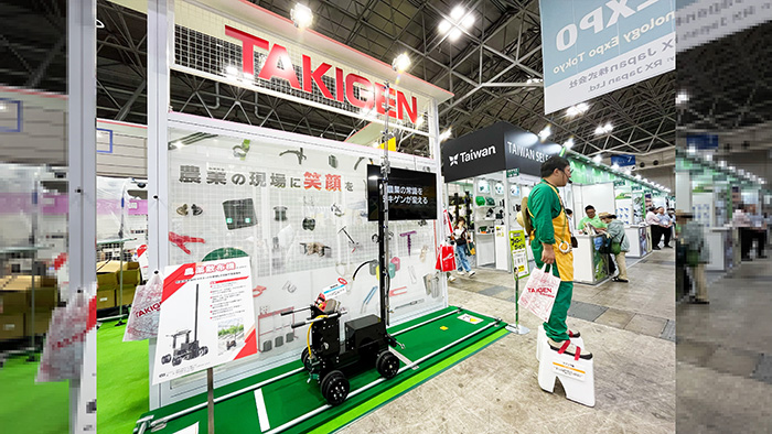 広い会場内には、トラクターやドローンのほか、人の運搬作業を補助するロボットも展示されていました。荷物を載せたまま人や台車の後ろを追従する運搬ロボットは、農業現場の人手不足解消や労力の削減に役立ちます。対象物の際を正確に捉えた鋭い走行が印象的でした!