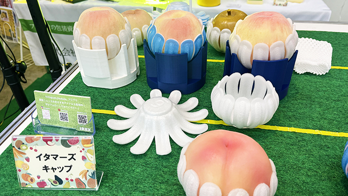 株式会社イケックスのブースでは、片手&ワンタッチで梱包できる「イタマーズ キャップ」が注目を集めていました。果実をのせると、一瞬で果実を包み込む形状に変化します。