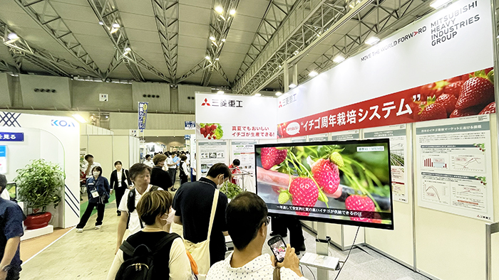 「真夏でもおいしいイチゴが生産できる!」「イチゴの周年栽培システム」の文字が目を引く三菱重工のブースを訪れました。