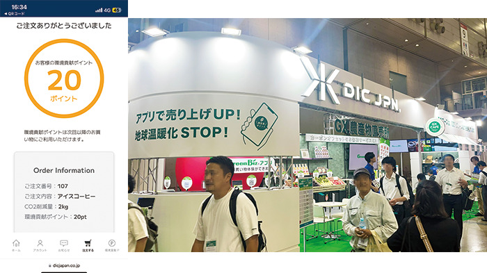 ディーアイシージャパン株式会社は、カーボンオフセットを「見える化」するアプリを開発し、100%グリーン電力のブースでコーヒーやお茶を無料提供していました。